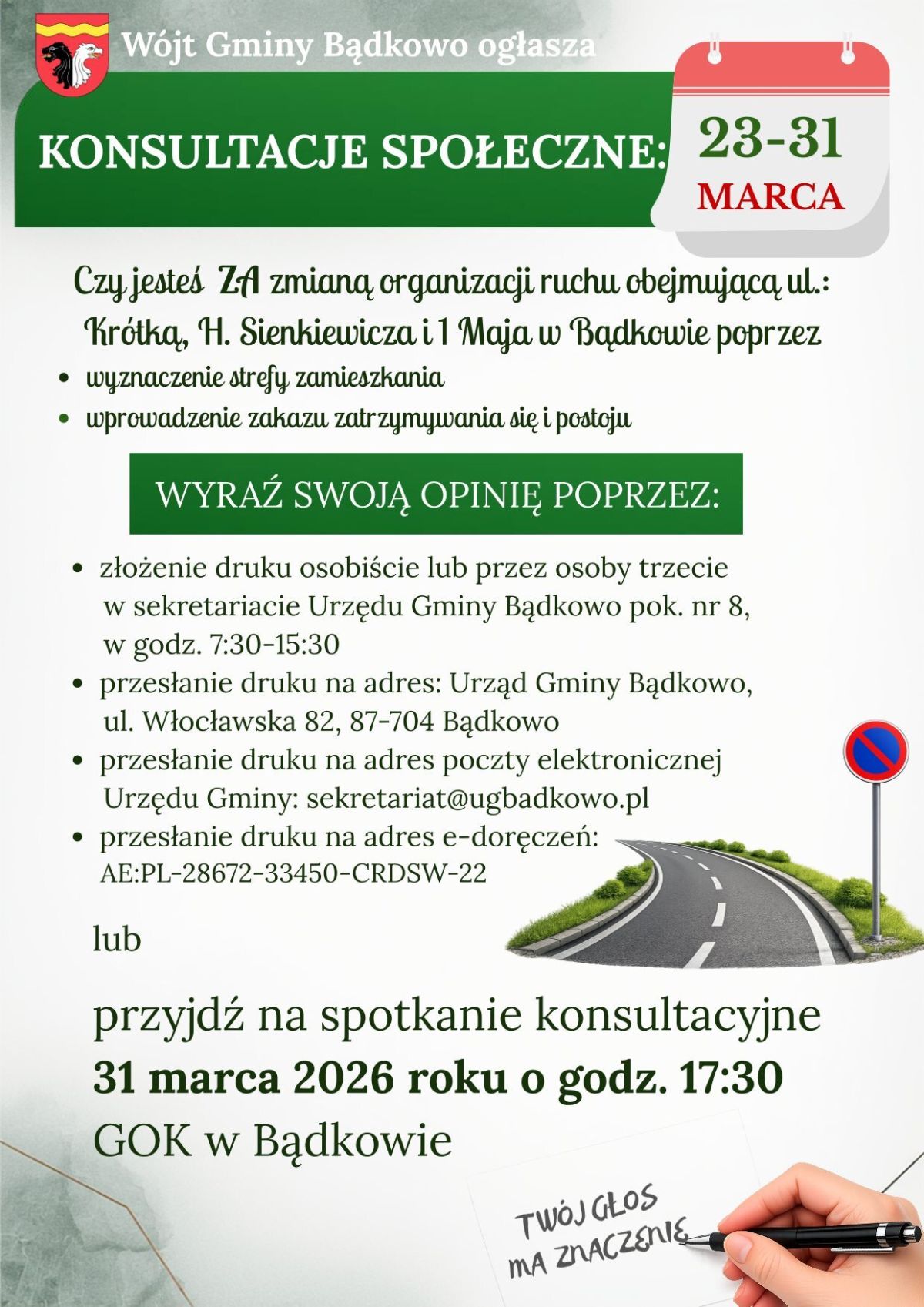 W związku powyższym, wydane zostało Zarządzenie Nr 21/2026Wójta Gminy Bądkowo z dnia 20 marca 2026 roku w sprawie PRZEPROWADZENIA KONSULTACJI SPOŁECZNYCH Z MIESZKAŃCAMI GMINY BĄDKOWO DOTYCZĄCE ZMIANY ORGANIZACJI RUCHU W OBRĘBIE ULIC: KRÓTKIEJ, HENRYKA SIENKIEWICZA I 1 MAJA W MIEJSCOWOŚCI BĄDKOWO .