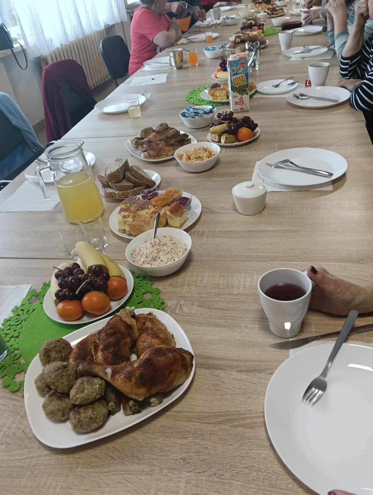Świętowaliśmy imieniny Pani Bożenki i urodziny Pani Elżbiety. Panie przygotowały dla nas mnóstwo pyszności. Były udka pieczone z sosem tatarskim, kaszanka, wędliny i oczywiście tort. Czas upłynął nam bardzo miło przy rozmowach i ulubionych dźwiękach muzyki.