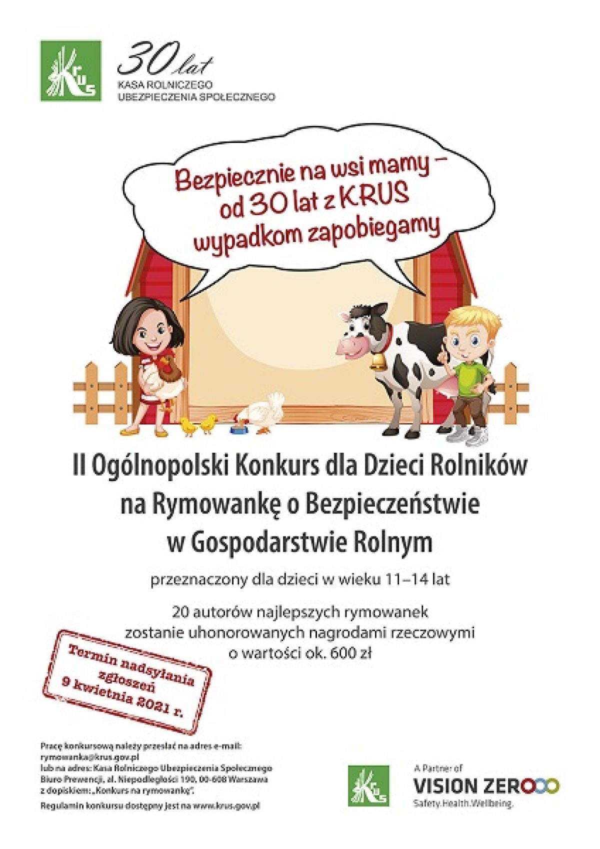 Kasa Rolniczego Ubezpieczenia Społecznego ogłasza II edycję Ogólnopolskiego Konkursu dla Dzieci na Rymowankę o Bezpieczeństwie w Gospodarstwie Rolnym i zaprasza dzieci w wieku od 11 do 14 lat, których przynajmniej jeden z rodziców lub opiekun prawny podlega ubezpieczeniu społecznemu rolników w okresie przyjmowania zgłoszeń do Konkursu.