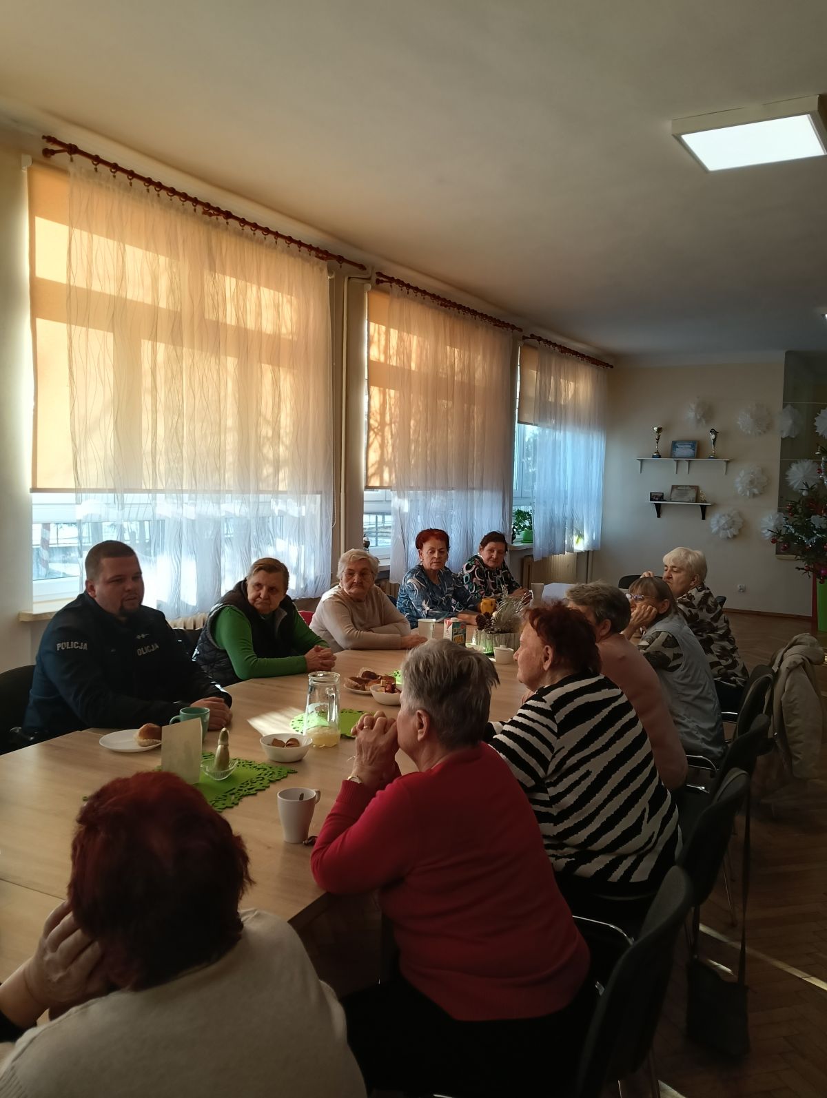 Dzielnicowy gminy Bądkowo asp. Konrad Rosół nasze spotkanie rozpoczął od przedstawienia się oraz omówienia najważniejszych tematów dotyczących bezpieczeństwa seniorów i nie tylko. Ponadto omówił najczęstsze zagrożenia, takie jak oszustwa „na wnuczka” i „na policjanta”, kradzieże, a także niebezpieczeństwa związane z korzystaniem z telefonu i Internetu. Przekazał praktyczne wskazówki, jak rozpoznawać próby wyłudzeń i jak zachować się w sytuacjach budzących niepokój.