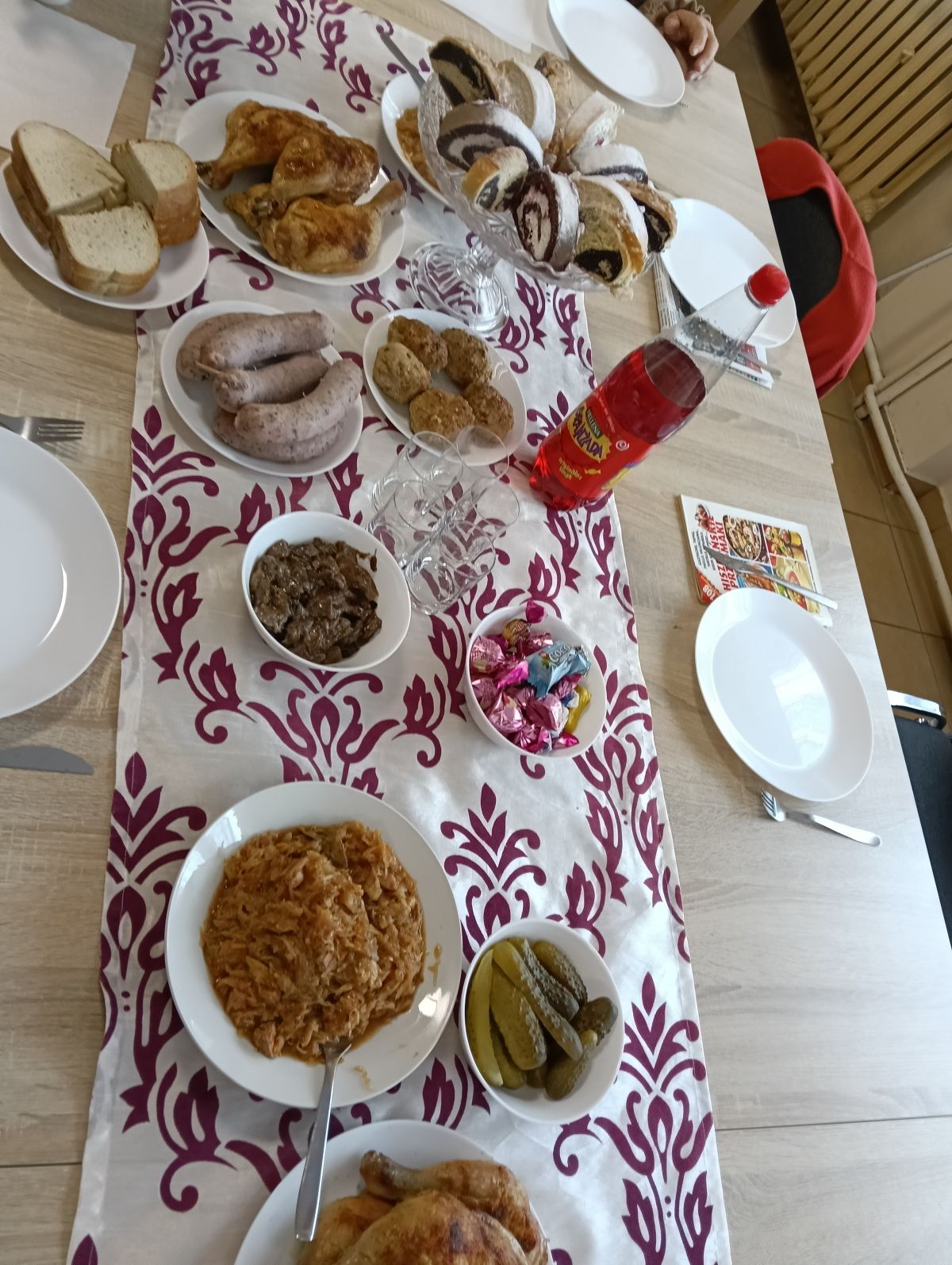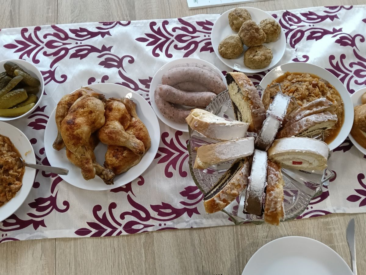 Potem był czas na smaczne jedzenie: pieczone udko, domowy chleb i przetwory (u nas buraczki i sałatka z kapusty). Oczywiście była też kawa i coś słodkiego.