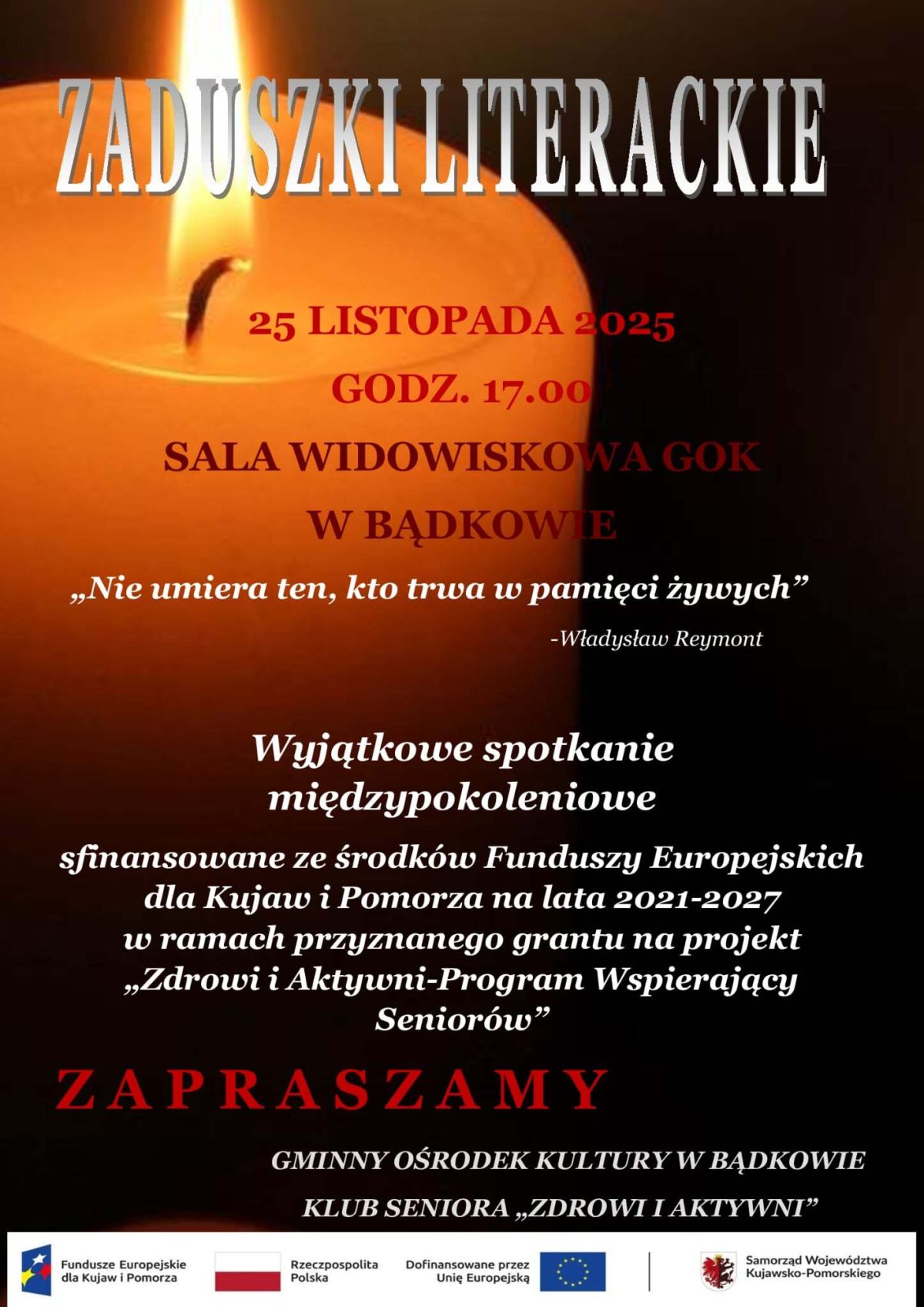 Zaduszki Literackie zrealizowane w ramach projektu „Zdrowi i Aktywni – Program Wspierający Seniorów”, współfinansowanego ze środków Funduszy Europejskich dla Kujaw i Pomorza na lata 2021–2027.