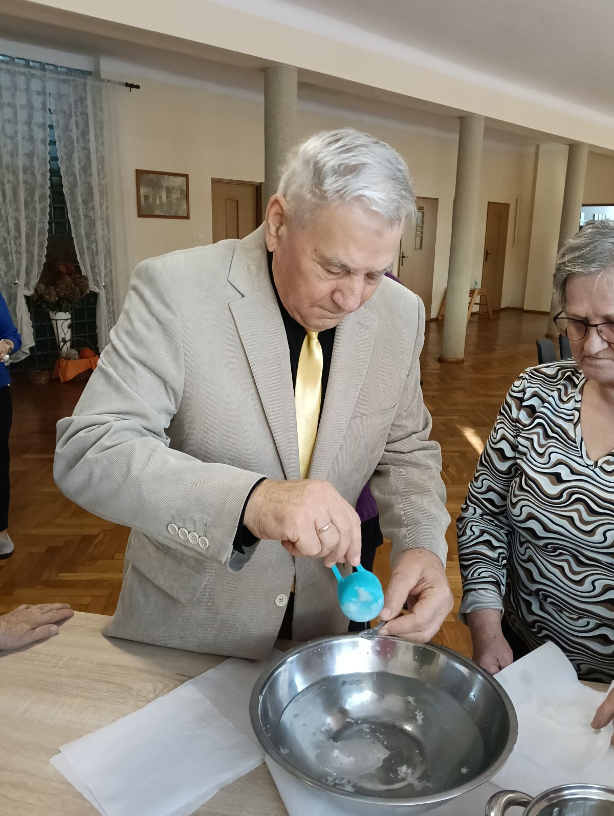 Co wykorzystaliśmy? Słoik z zakrętką, dekoracyjną trawkę, styropianowe jajko, serwetki, kwiat hiacynt i kilka innych dodatków. Trochę pracy pod czujnym okiem specjalisty i gotowe. Przyznać należy, że wyszło znakomicie! Klubowicze z wielkim zaangażowaniem tworzyli dekoracje, które już od dziś będą ozdabiać ich domy!