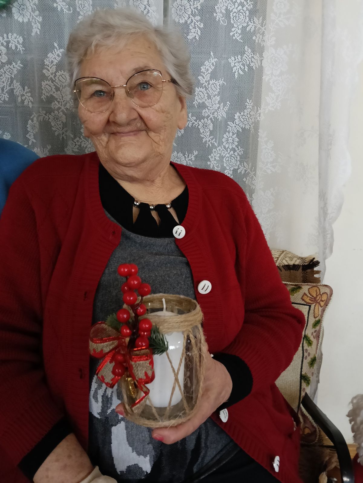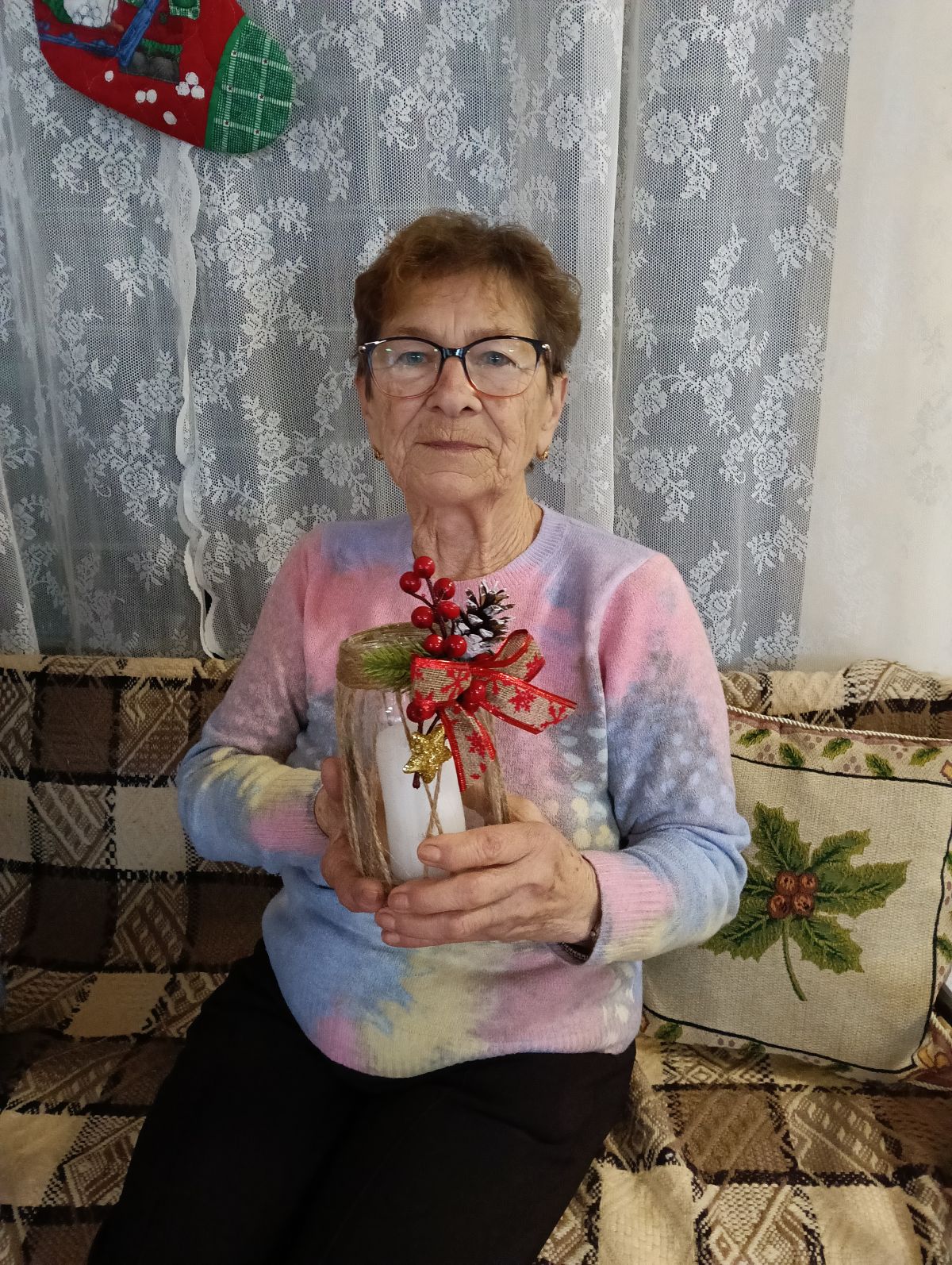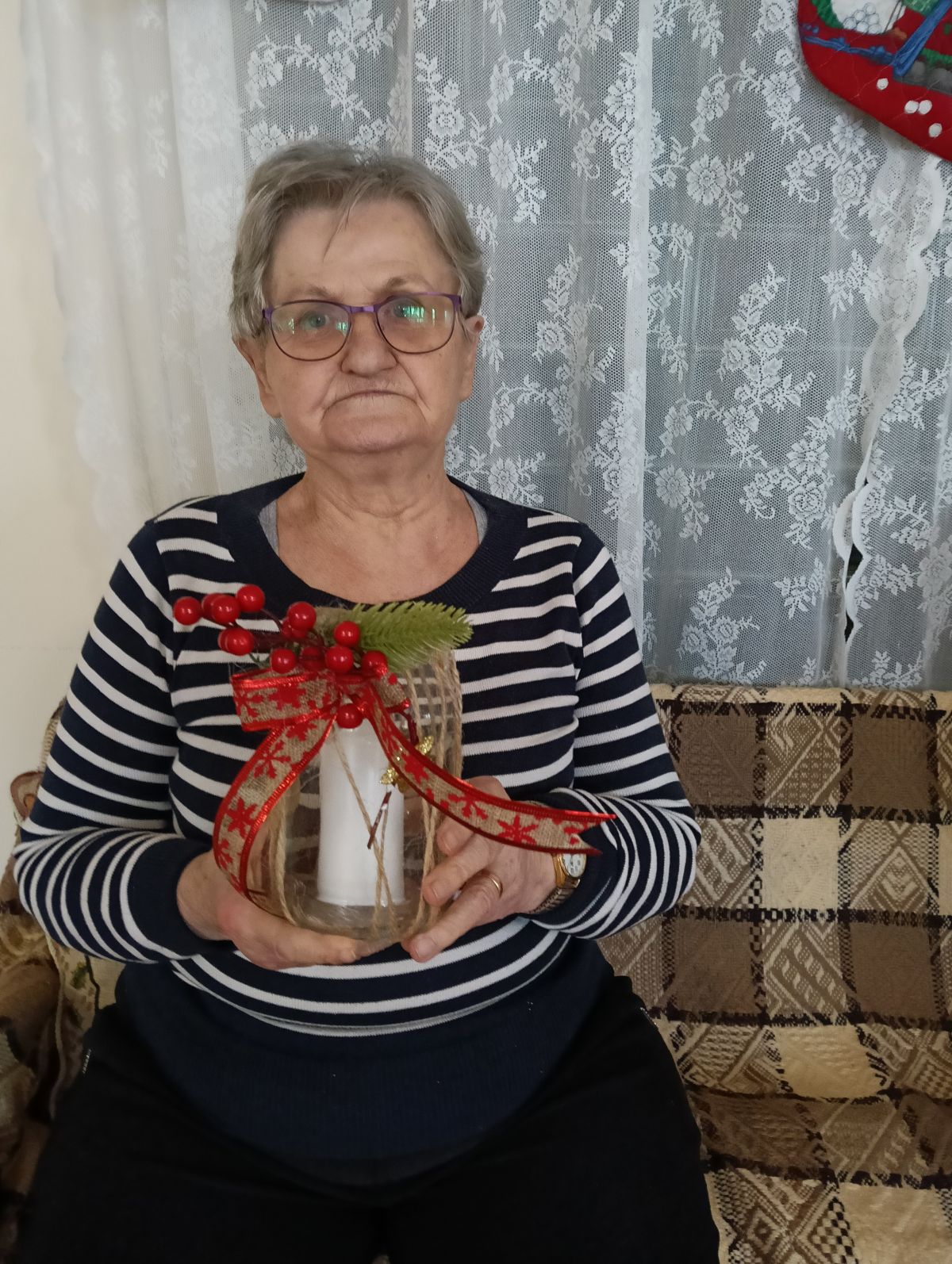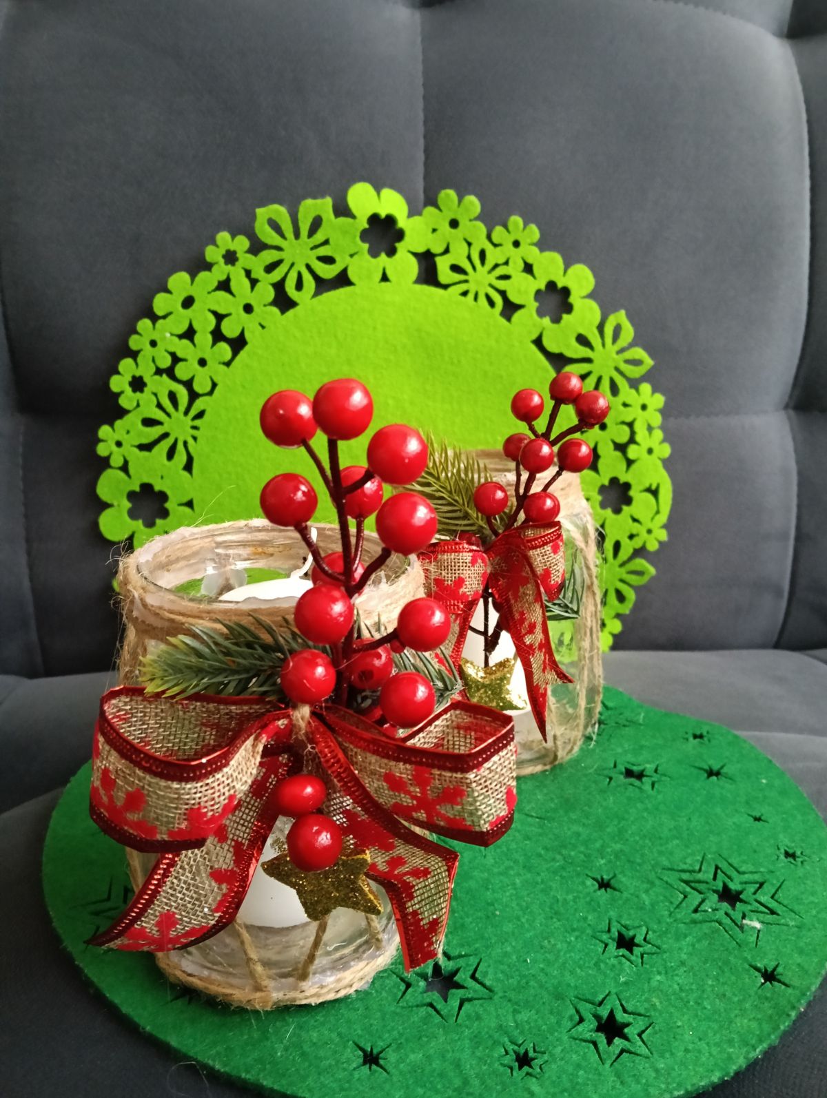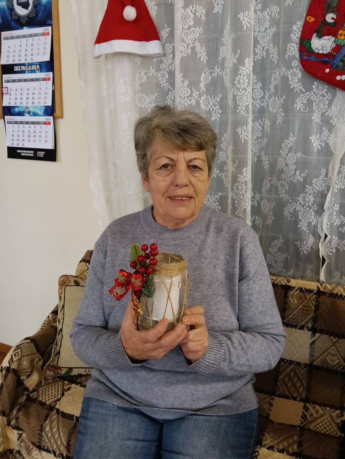 Słoik owinięty jutowym sznurkiem, co nadaje mu rustykalny, naturalny styl. Ozdobiony dużą kokardą wykonaną z jutowej wstążki z czerwonym wzorem oraz dekoracyjnymi elementami – czerwonymi, błyszczącymi jagodami, małymi gałązkami sztucznej choinki i złote, błyszczące gwiazdki. W środku biała świeca, która dopełnia wyglądu całości.